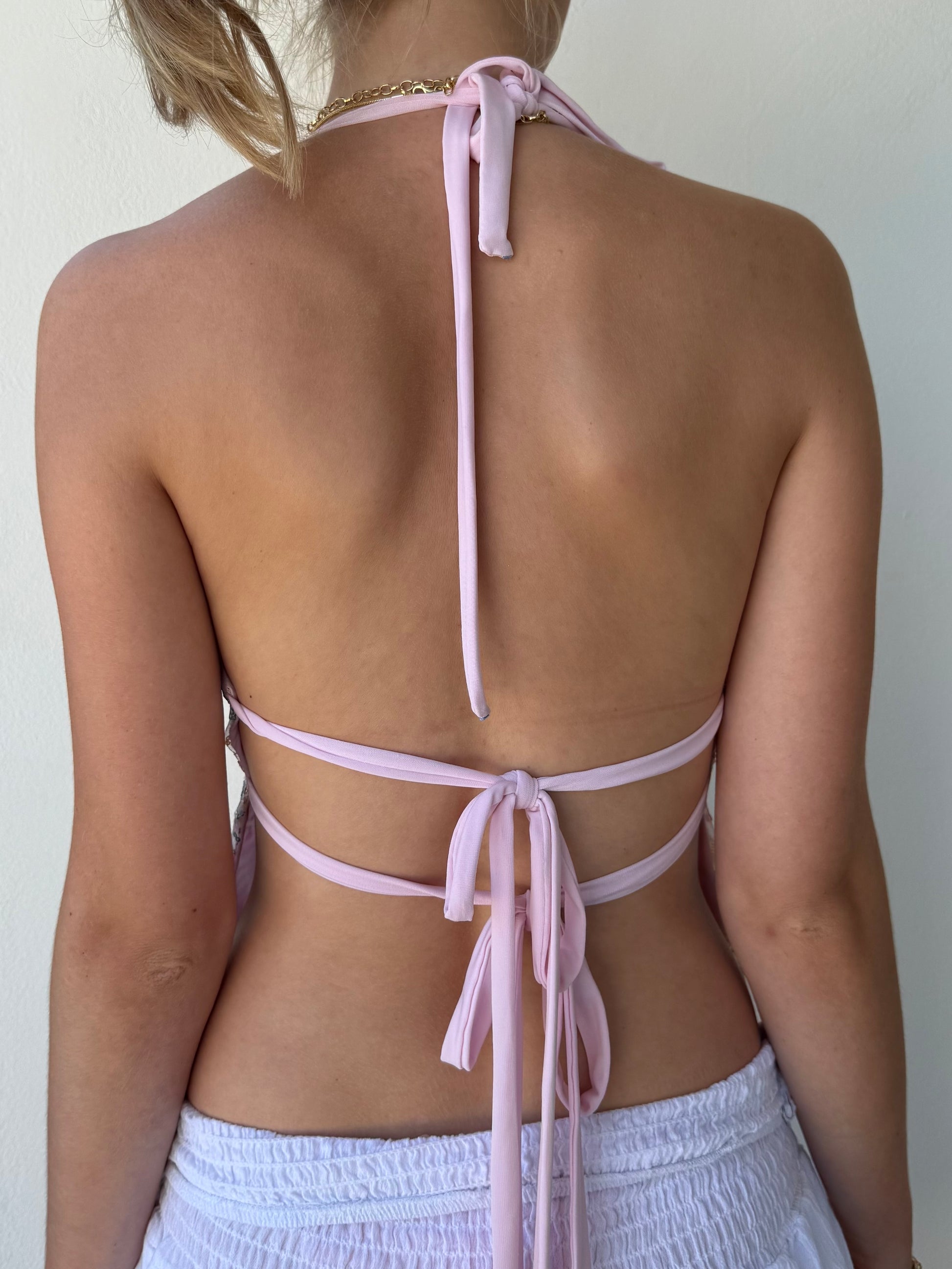 Pink with rainbow sequins backless tie halter neck top with beaded embroidery. Adjustable around the neck and the back. Recommended fit for size UK 6-12.
