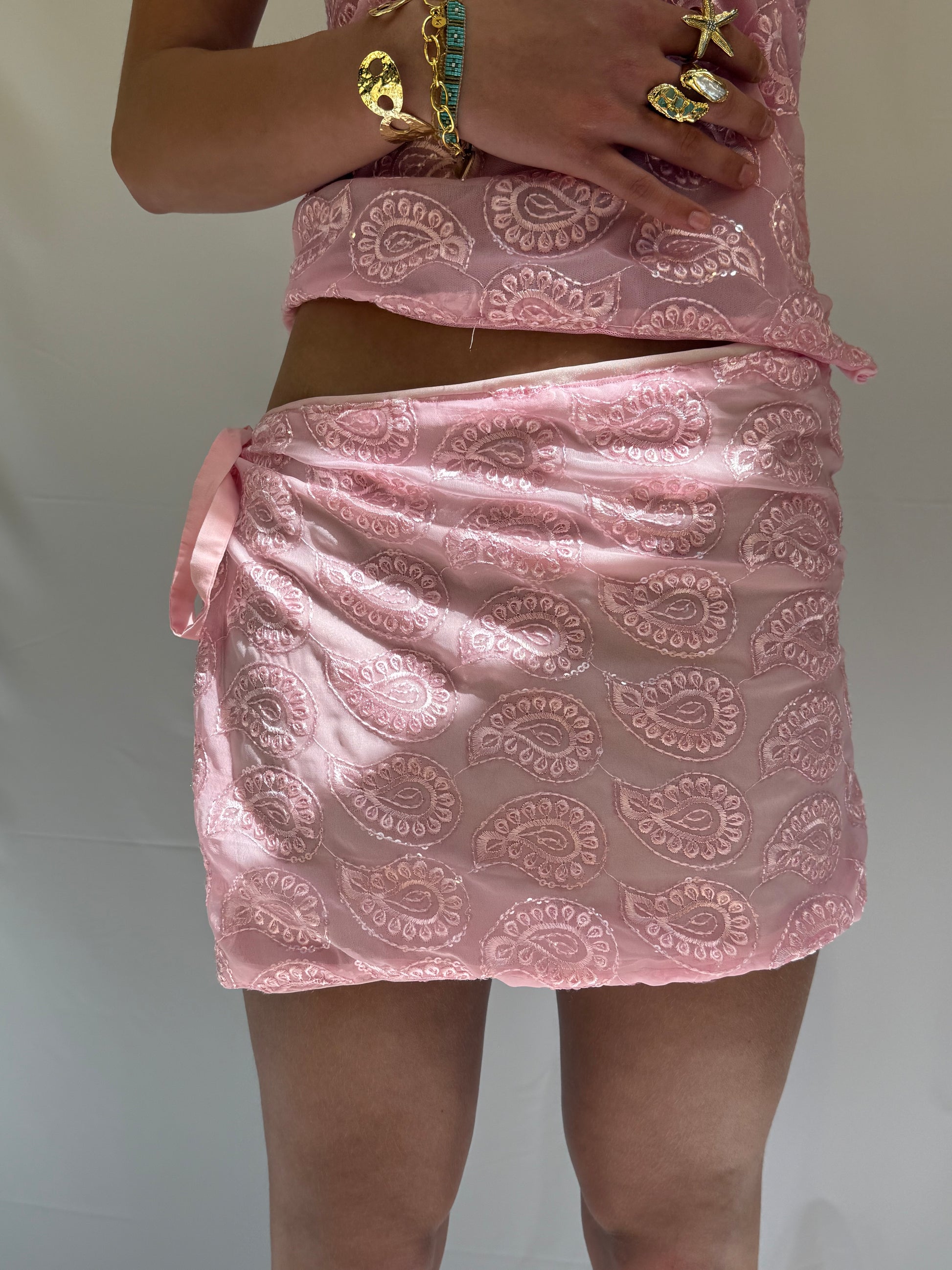 Tie wrap skirt with paisley light pink sequinned material. Recommended size UK 4-8. This can also be worn as a top like in the picture!