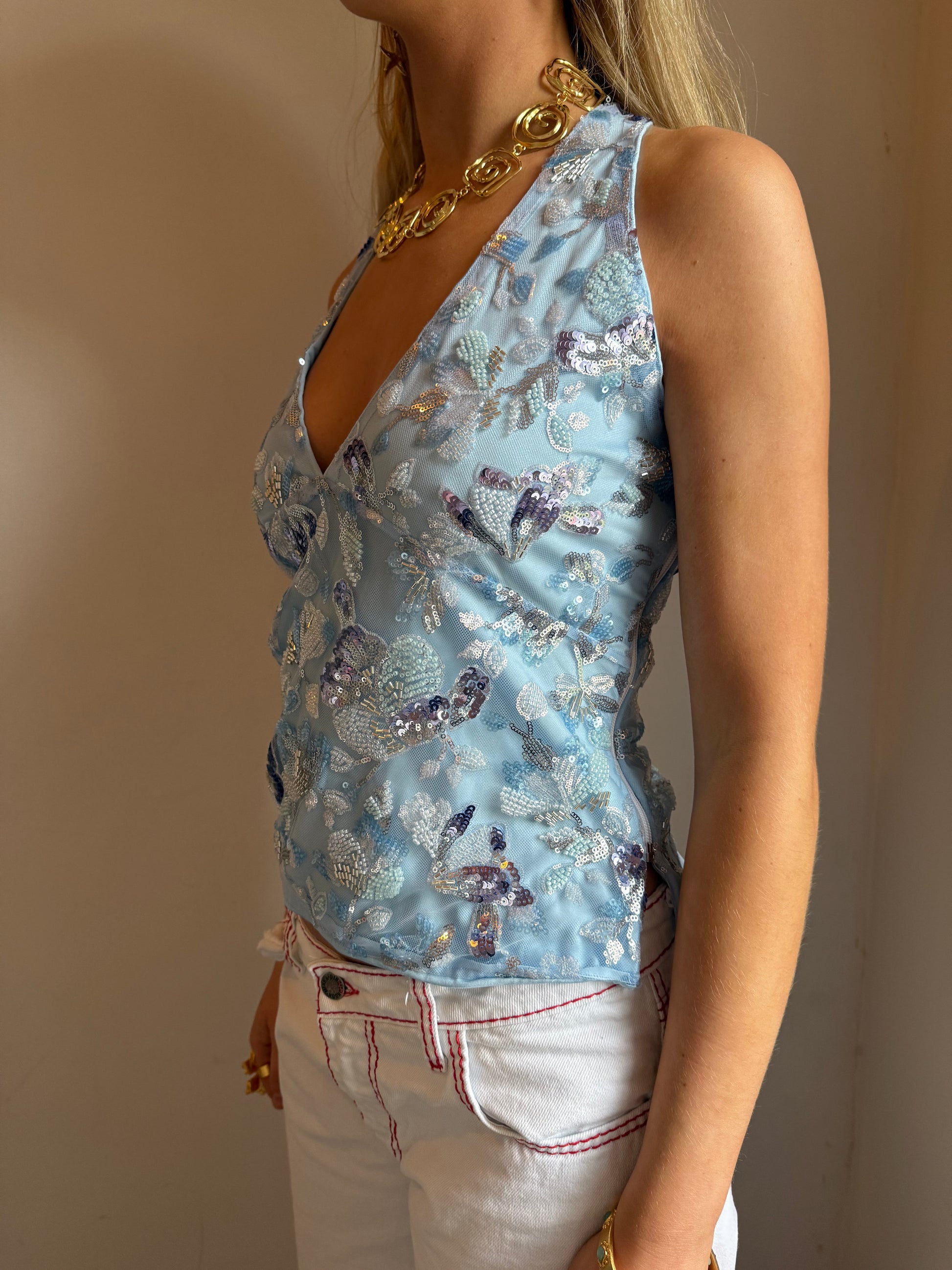 Top with a back in sequin and beaded multi blue with floral pattern. Recommended sizes: Small (UK 6-8) and Medium (UK 10-12).